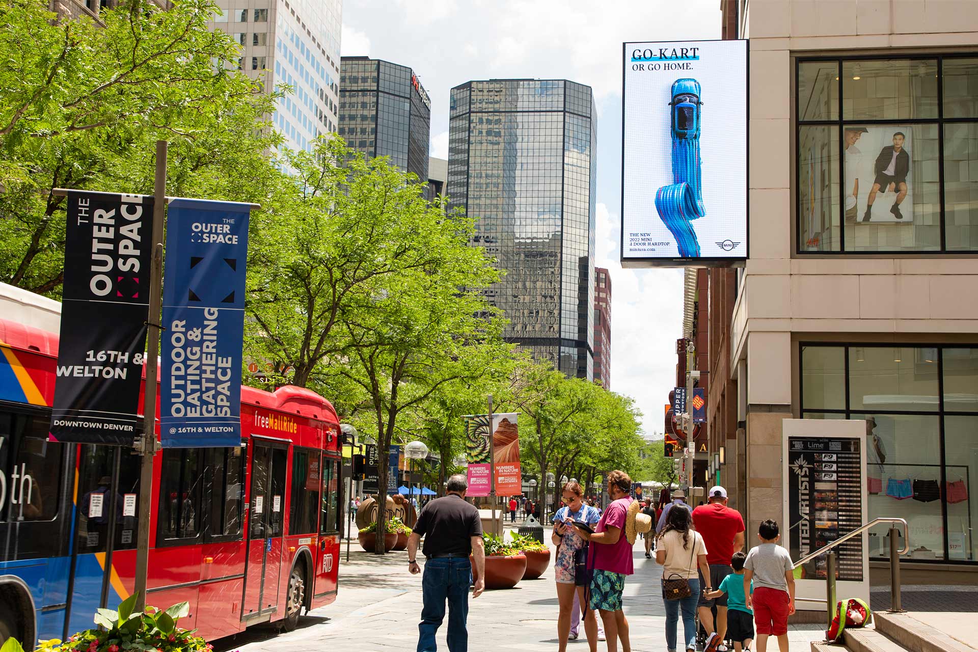We offer coverage throughout Denver’s most dynamic Downtown district with architecturally integrated wallscapes, large-format digital screens, and a network of unique interactive digital kiosks (IKE) that provide valuable public services and community resources. Our assets reach highly engaged audiences in the Central Business District, Theatre District, and 16th Street – areas bustling with retail, entertainment, dining, and business establishments.
